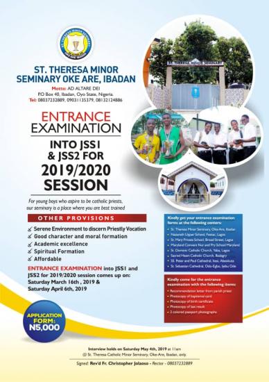 WE ADMIT TO JSS ONE AND TWO ONLY WITH COMMON ENTRANCE AND INTERVIEW - MALE CHILD ASPIRING TO BE CATHOLIC PRIEST/RELIGIOUS. HE MUST BE AT LEAST 10 YEARS OLD. HE MUST HAVE COMPLETED PRIMARY SCHOOL OR IN FINAL CLASS. HE MUST BE FROM A GOOD AND PRACTICING CATHOLIC HOME. HE MUST BE A COMMUNICANT.